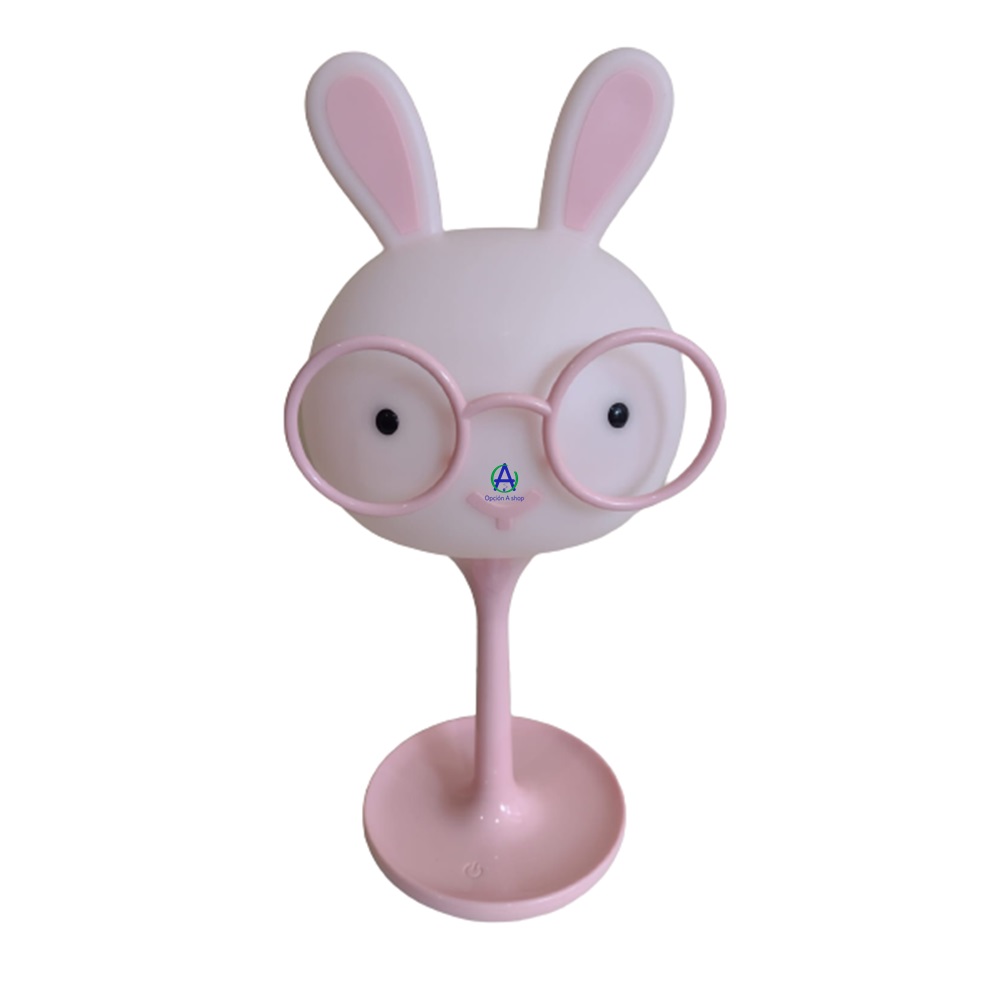 Lámpara decorativa con la figura de conejita con lentes, es recagable y la luz es graduable en 3 intensidades.