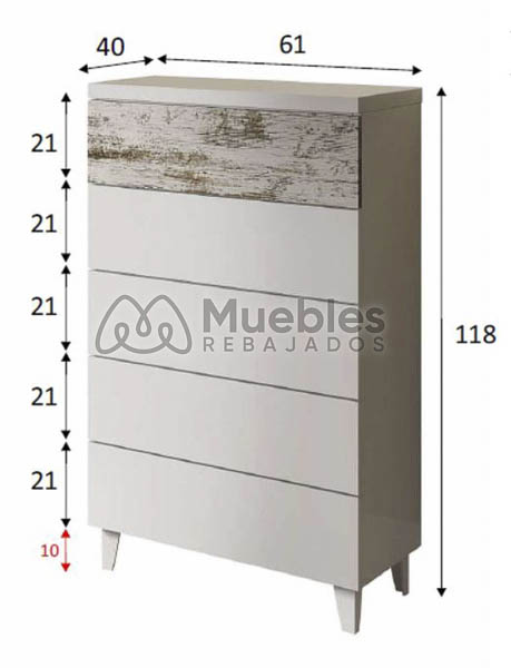 - Mueble: 118 cm (alto) x 61 cm (ancho) x 40 cm (prof.)