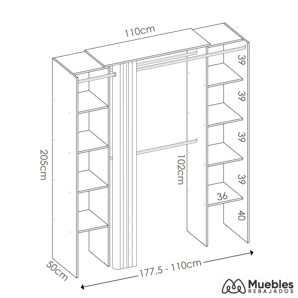 Sobre sus características, dispone de 3 barras de colgar y 2 cajones con guías metálicas de suave deslizamiento con el interior en acabado textil. También incluye una gran variedad de estantes fijos para almacenar toda clase de pertenencias y una cortina con 10 ollaos de poliéster. Finalmente, este vestidor tiene un montaje reversible, es decir, la columna con cajón puede montarse a la derecha o a la izquierda.
