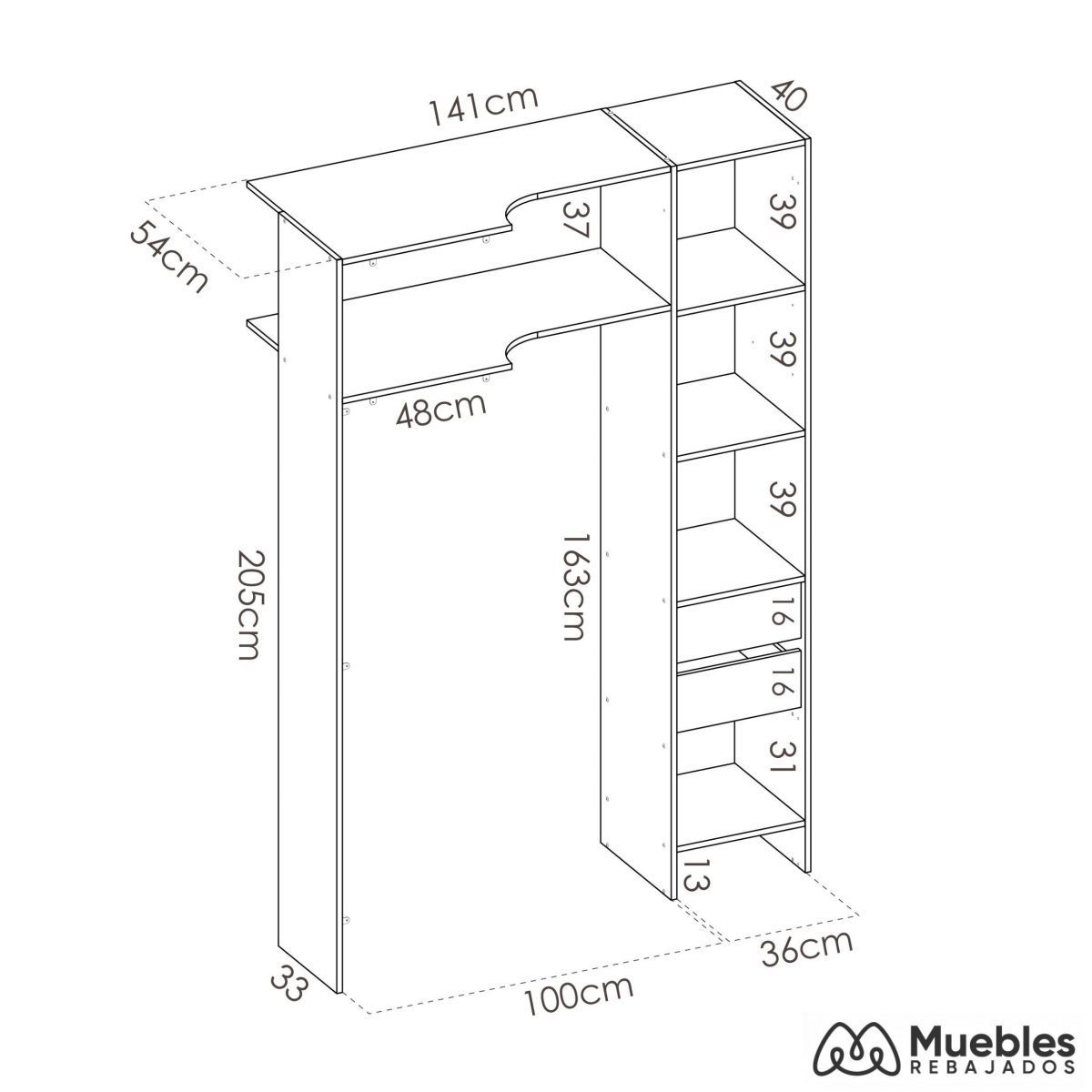 - Dimensiones: 205 cm (alto) x 318,5/251 cm (ancho) x 54 cm (Prof.)