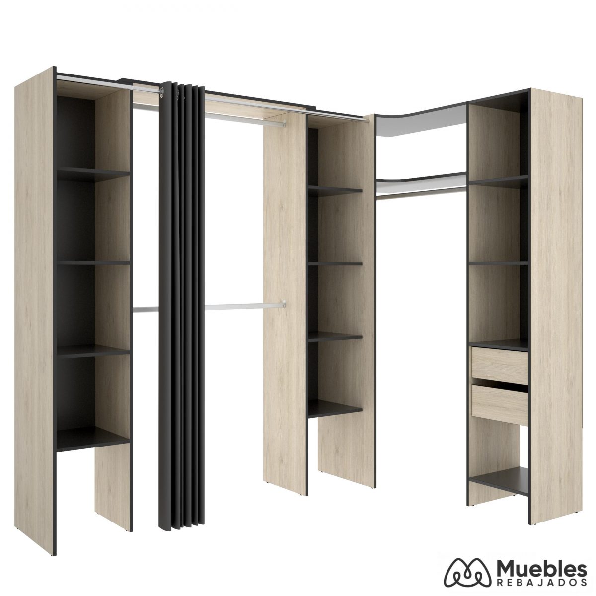 La nueva gama Suit se caracteriza por haber fabricado unos nuevos vestidores esquineros que te van a dejar boquiabierto. Es por eso que nosotros queremos lo mejor para vosotros y te mostramos el nuevo Vestidor esquinero con 2 cajones y cortina de la gama Suit, un maravilloso vestidor capaz de enamorar a cualquiera nada más colocarlo en tu espacio. Suit tiene la capacidad de redecorar por completo tu espacio y de darle un toque de modernidad y elegancia. Además, te da la oportunidad de tener ese rincón especial tan esperado para poner toda la ropa y zapatos sin necesidad de ocupar espacio en tu dormitorio. Está fabricado con melamina de alta calidad y tiene unos preciosos acabados en color Blanco y Roble Natural – Grafito.